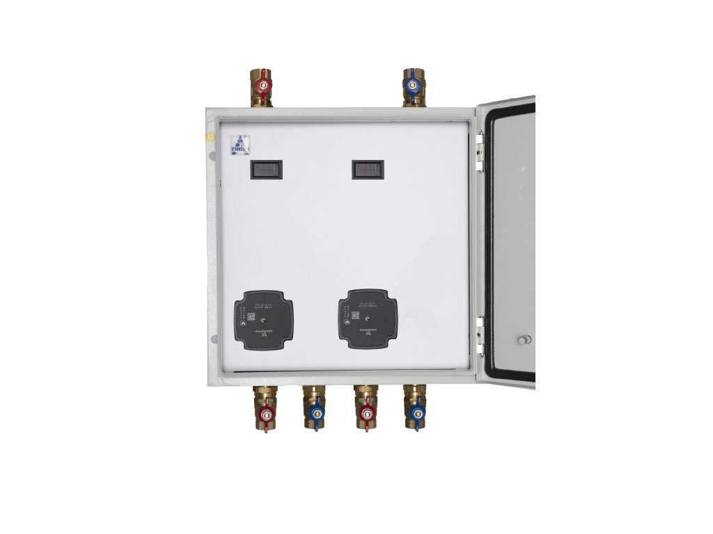 FinBox - Univerzálne riešenie čerpadlových skupín\nFinBox je moderné a univerzálne riešenie čerpadlových skupín, ktoré ponúka až 7 rôznych kombinácií v kompaktnom uzamykateľnom boxe s krytím IP64. Je navrhnutý na použitie vo vykurovacích a chladiacich systémoch, pričom umožňuje pripojenie okruhu s požadovanou teplotou vykurovacej vody – či už nižšou alebo vyššou ako teplota z prívodného zdroja tepla. Zároveň môže slúžiť ako ochrana zdroja tepla pred nízkoteplotnou koróziou.\n\nKľúčové vlastnosti:\n• Kompaktné prevedenie: FinBox je vhodný na montáž priamo pod kotol, čím šetrí priestor.\n• Flexibilné použitie: Možnosť inštalovať obehové čerpadlo od rôznych výrobcov so stavebnou dĺžkou 130 mm. Pripojenie čerpadla je zabezpečené cez prevlečnú maticu s vnútorným závitom 1“.\n• Presné meranie: Každá čerpadlová skupina je vybavená sondami na meranie teploty média, pričom hodnoty teplôt sú prehľadne zobrazené na elektronických displejoch na prednej strane krytu.\n• Vyhotovenie s rozdeľovačom: Možnosť výberu medzi rozdeľovačom alebo rozdeľovačom s integrovanou hydraulickou výhybkou (anuloidom).\n\n\nTechnické parametre:\n• Maximálny prietok cez rozdeľovač (zo strany kotla): 1500 l/h\n• Maximálny prietok s 3D termostatickým ventilom: 1100 l/h\n• Maximálny prietok s 3D ventilom so servopohonom: 1300 l/h\n• Maximálny prietok bez zmiešavania: 1350 l/h\n• Určené pre kotly s maximálnym výkonom do 26 kW\n• Skontrolované na tesnosť a pripravené na okamžitú prevádzku\n\nObsah balenia:\n\nKaždá sada obsahuje redukované guľové ventily 1“x3/4“ (6 ks s tesnením). \n\nPodľa konfigurácie môžu byť v balení nasledujúce komponenty:\n\n• Čerpadlo: Grundfos UPM3 AUTO 15-70 130\n• Zmiešavací ventil: ESBE VRG 132 1“, Kvs 6,3 m³/h\n• Termostatický ventil: ESBE VTA 372 1“, 3,4 m³/h, 20-43 °C\n• Pohon: ESBE ARA 561 (230V, trojbodový) alebo na požiadanie pohon ESBE ARA 639 (proporcionálny 24V / 0-10V)\n\nFinBox predstavuje spoľahlivé, flexibilné a efektívne riešenie na optimalizáciu vykurovacích a chladiacich systémov, ktoré spĺňa vysoké technické aj bezpečnostné štandardy.\nSkontrolované na tesnosť a pripravené na okamžitú prevádzku\nVšetky náhradné komponenty máme skladom.Dodatočné parametre
