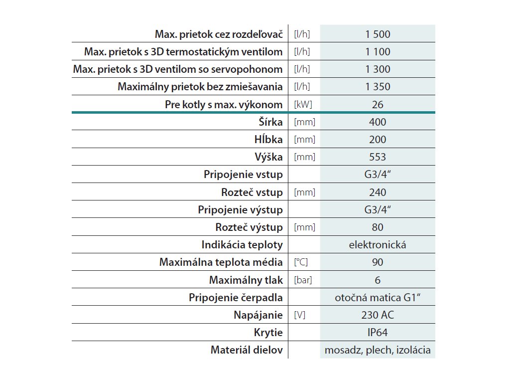 FinBox - Univerzálne riešenie čerpadlových skupín\nFinBox je moderné a univerzálne riešenie čerpadlových skupín, ktoré ponúka až 7 rôznych kombinácií v kompaktnom uzamykateľnom boxe s krytím IP64. Je navrhnutý na použitie vo vykurovacích a chladiacich systémoch, pričom umožňuje pripojenie okruhu s požadovanou teplotou vykurovacej vody – či už nižšou alebo vyššou ako teplota z prívodného zdroja tepla. Zároveň môže slúžiť ako ochrana zdroja tepla pred nízkoteplotnou koróziou.\n\nKľúčové vlastnosti:\n• Kompaktné prevedenie: FinBox je vhodný na montáž priamo pod kotol, čím šetrí priestor.\n• Flexibilné použitie: Možnosť inštalovať obehové čerpadlo od rôznych výrobcov so stavebnou dĺžkou 130 mm. Pripojenie čerpadla je zabezpečené cez prevlečnú maticu s vnútorným závitom 1“.\n• Presné meranie: Každá čerpadlová skupina je vybavená sondami na meranie teploty média, pričom hodnoty teplôt sú prehľadne zobrazené na elektronických displejoch na prednej strane krytu.\n• Vyhotovenie s rozdeľovačom: Možnosť výberu medzi rozdeľovačom alebo rozdeľovačom s integrovanou hydraulickou výhybkou (anuloidom).\n\n\nTechnické parametre:\n• Maximálny prietok cez rozdeľovač (zo strany kotla): 1500 l/h\n• Maximálny prietok s 3D termostatickým ventilom: 1100 l/h\n• Maximálny prietok s 3D ventilom so servopohonom: 1300 l/h\n• Maximálny prietok bez zmiešavania: 1350 l/h\n• Určené pre kotly s maximálnym výkonom do 26 kW\n• Skontrolované na tesnosť a pripravené na okamžitú prevádzku\n\nObsah balenia:\n\nKaždá sada obsahuje redukované guľové ventily 1“x3/4“ (6 ks s tesnením). \n\nPodľa konfigurácie môžu byť v balení nasledujúce komponenty:\n\n• Čerpadlo: Grundfos UPM3 AUTO 15-70 130\n• Zmiešavací ventil: ESBE VRG 132 1“, Kvs 6,3 m³/h\n• Termostatický ventil: ESBE VTA 372 1“, 3,4 m³/h, 20-43 °C\n• Pohon: ESBE ARA 561 (230V, trojbodový) alebo na požiadanie pohon ESBE ARA 639 (proporcionálny 24V / 0-10V)\n\nFinBox predstavuje spoľahlivé, flexibilné a efektívne riešenie na optimalizáciu vykurovacích a chladiacich systémov, ktoré spĺňa vysoké technické aj bezpečnostné štandardy.\nSkontrolované na tesnosť a pripravené na okamžitú prevádzku\nVšetky náhradné komponenty máme skladom.Dodatočné parametre