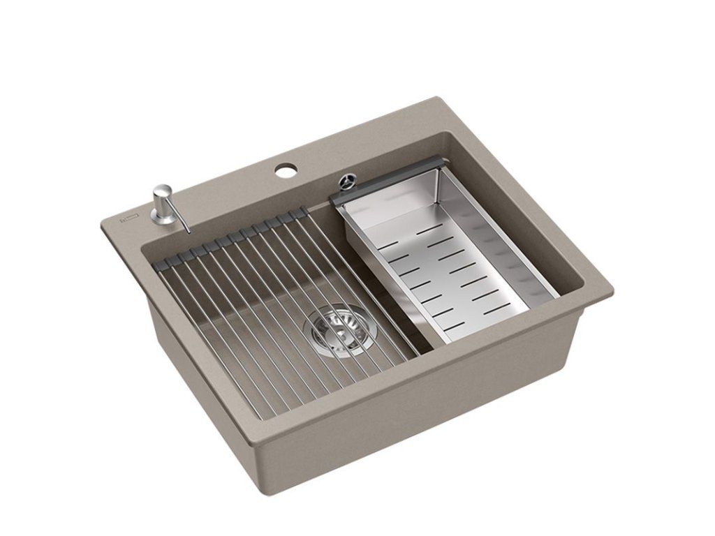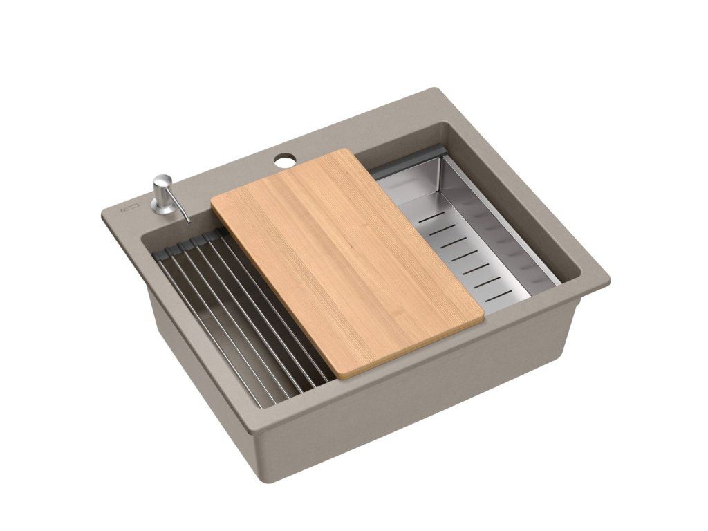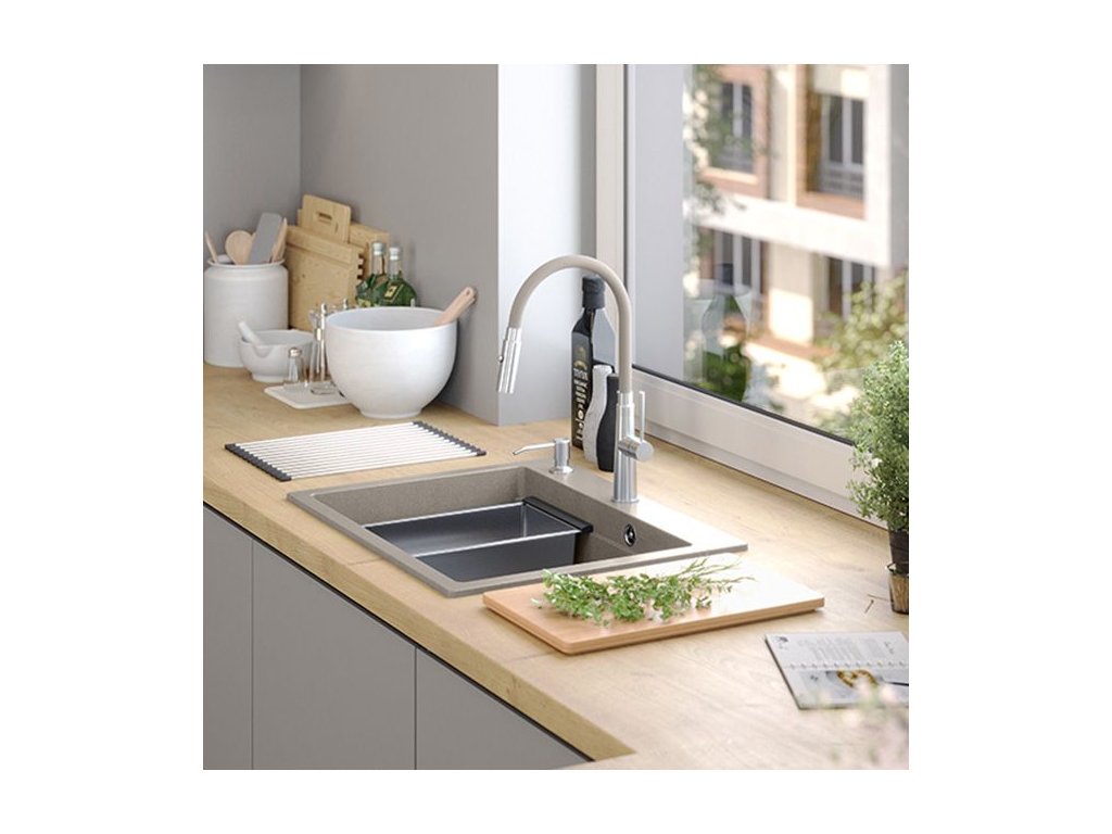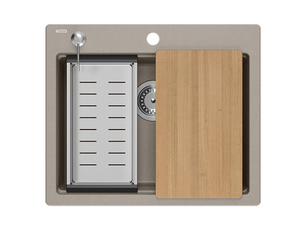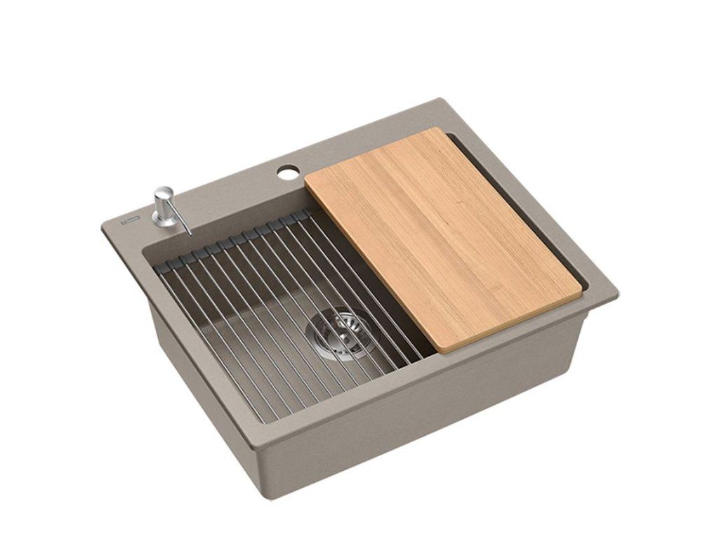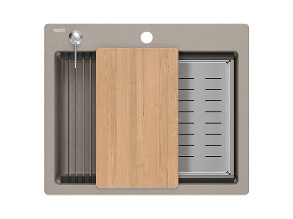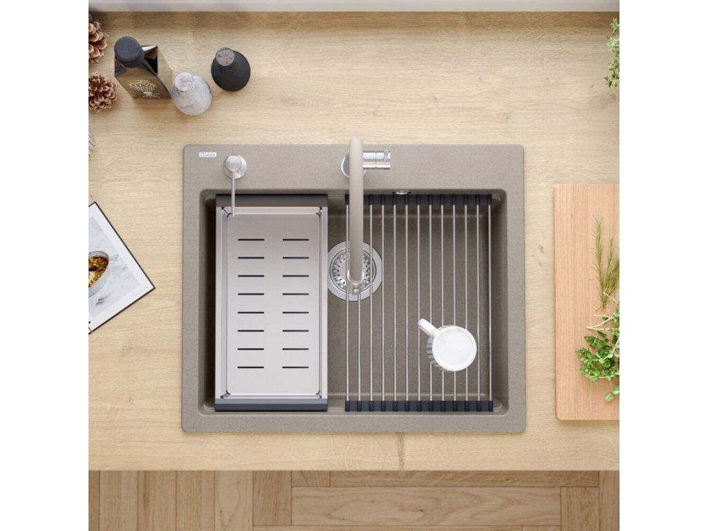 Dranitový drez vyrobený s minimalistickým moderným vzhľadom zapadne do aranžmánu každej kuchyne. Hlboká a priestranná komora zaisťuje vysoký komfort používania. Umývadlo, ktoré ponúkame, je skvelou voľbou pre zákazníkov, ktorí ocenia kvalitu a spracovanie. Nadčasový tvar, použitie prvotriednych materiálov a technológií, skvelý dizajn a kompatibilita použitých riešení zaručujú dokonalý konečný výsledok a vyplnia každý kuchynský priestor. K dispozícii sú rôzne farebné varianty. Tento model je veľmi bohato vybavený doplnkovými kuchynskými doplnkami. Drez je dodávaný s dávkovačom tekutín, bambusovou doskou na krájanie, odkvapkávačom a valcovanou oceľovo-silikónovou podložkou.Dodatočné parametre