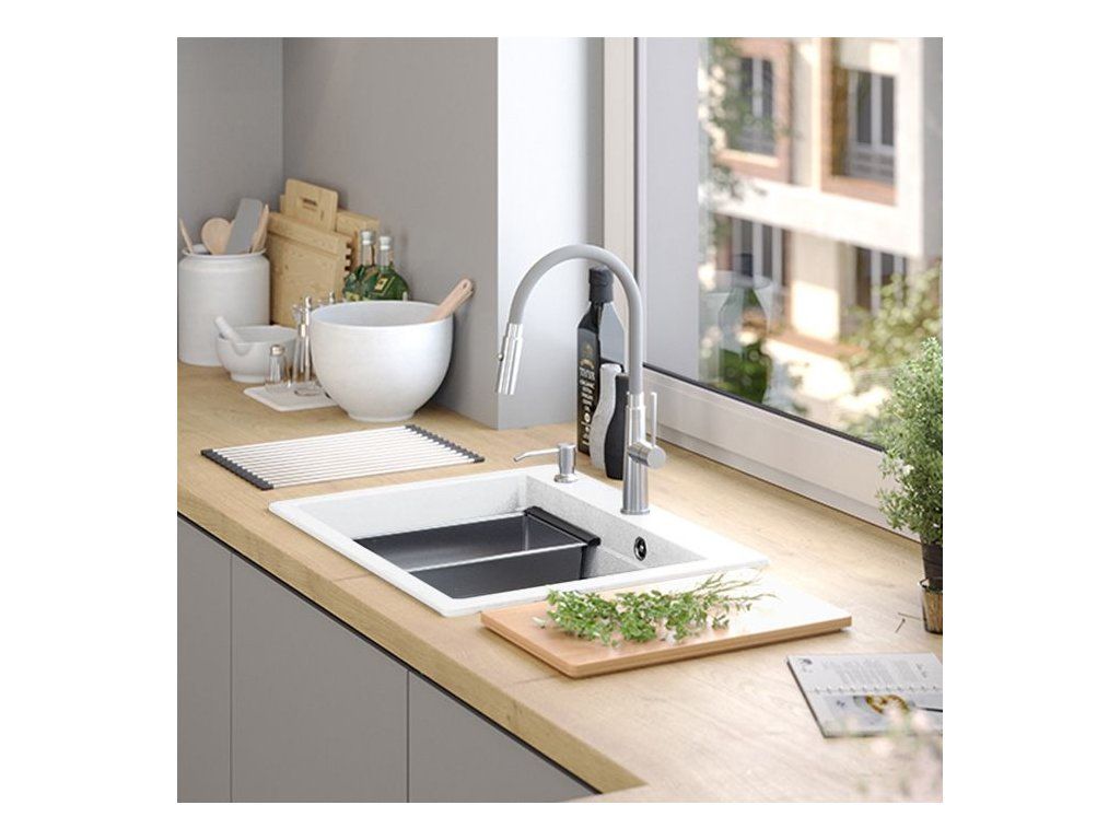 Dranitový drez vyrobený s minimalistickým moderným vzhľadom zapadne do aranžmánu každej kuchyne. Hlboká a priestranná komora zaisťuje vysoký komfort používania. Umývadlo, ktoré ponúkame, je skvelou voľbou pre zákazníkov, ktorí ocenia kvalitu a spracovanie. Nadčasový tvar, použitie prvotriednych materiálov a technológií, skvelý dizajn a kompatibilita použitých riešení zaručujú dokonalý konečný výsledok a vyplnia každý kuchynský priestor. K dispozícii sú rôzne farebné varianty. Tento model je veľmi bohato vybavený doplnkovými kuchynskými doplnkami. Drez je dodávaný s dávkovačom tekutín, bambusovou doskou na krájanie, odkvapkávačom a valcovanou oceľovo-silikónovou podložkou.Dodatočné parametre