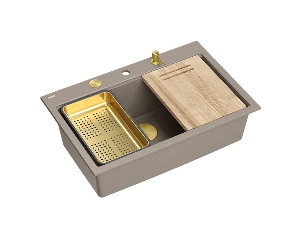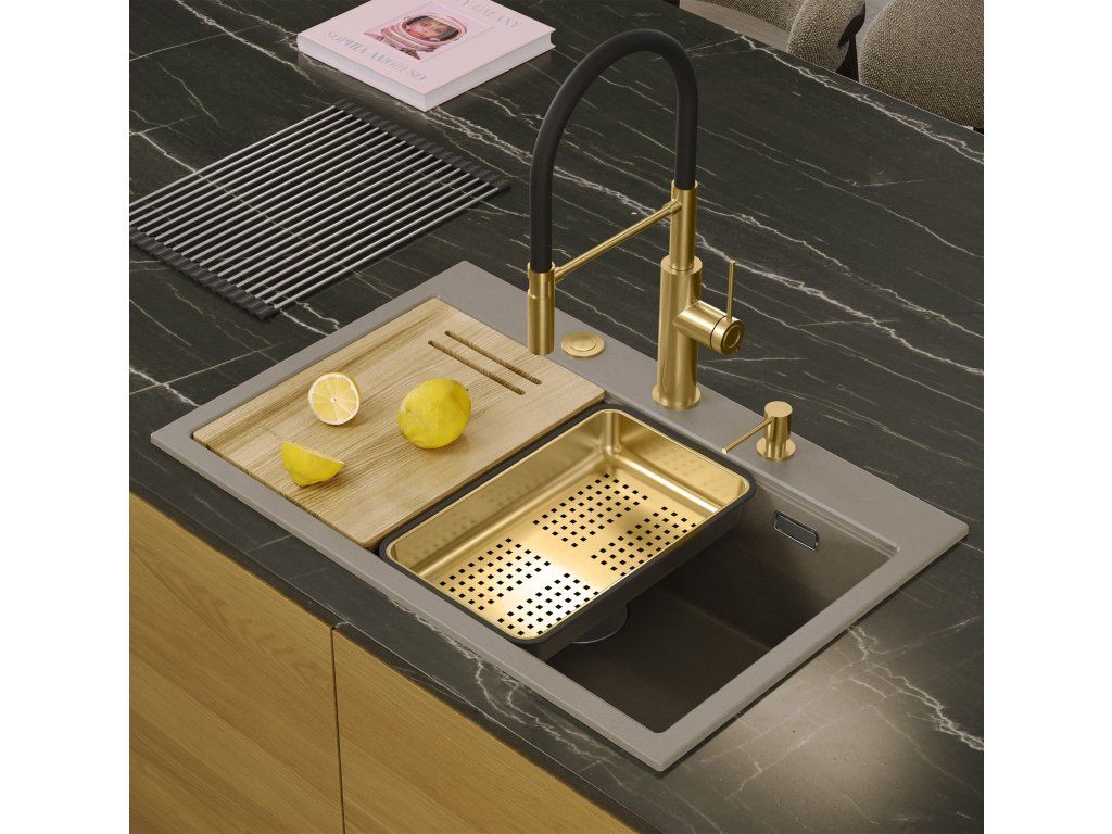 Dranitový drez vyrobený s minimalistickým moderným vzhľadom zapadne do aranžmánu každej kuchyne. Hlboká a priestranná komora zaisťuje vysoký komfort používania. Umývadlo, ktoré ponúkame, je skvelou voľbou pre zákazníkov, ktorí ocenia kvalitu a spracovanie. Nadčasový tvar, použitie prvotriednych materiálov a technológií, skvelý dizajn a kompatibilita použitých riešení zaručujú dokonalý konečný výsledok a vyplnia každý kuchynský priestor. K dispozícii sú rôzne farebné varianty. Tento model je veľmi bohato vybavený doplnkovými kuchynskými doplnkami. Drez je dodávaný s dávkovačom tekutín, bambusovou doskou na krájanie, odkvapkávačom a valcovanou oceľovo-silikónovou podložkou (nie je súčasťou sady v zlatej a medenej variante).Dodatočné parametre