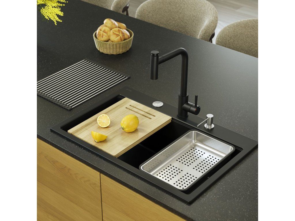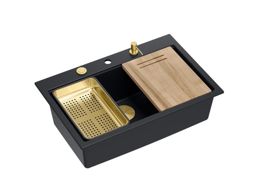 Dranitový drez vyrobený s minimalistickým moderným vzhľadom zapadne do aranžmánu každej kuchyne. Hlboká a priestranná komora zaisťuje vysoký komfort používania. Umývadlo, ktoré ponúkame, je skvelou voľbou pre zákazníkov, ktorí ocenia kvalitu a spracovanie. Nadčasový tvar, použitie prvotriednych materiálov a technológií, skvelý dizajn a kompatibilita použitých riešení zaručujú dokonalý konečný výsledok a vyplnia každý kuchynský priestor. K dispozícii sú rôzne farebné varianty. Tento model je veľmi bohato vybavený doplnkovými kuchynskými doplnkami. Drez je dodávaný s dávkovačom tekutín, bambusovou doskou na krájanie, odkvapkávačom a valcovanou oceľovo-silikónovou podložkou (nie je súčasťou sady v zlatej a medenej variante).Dodatočné parametre