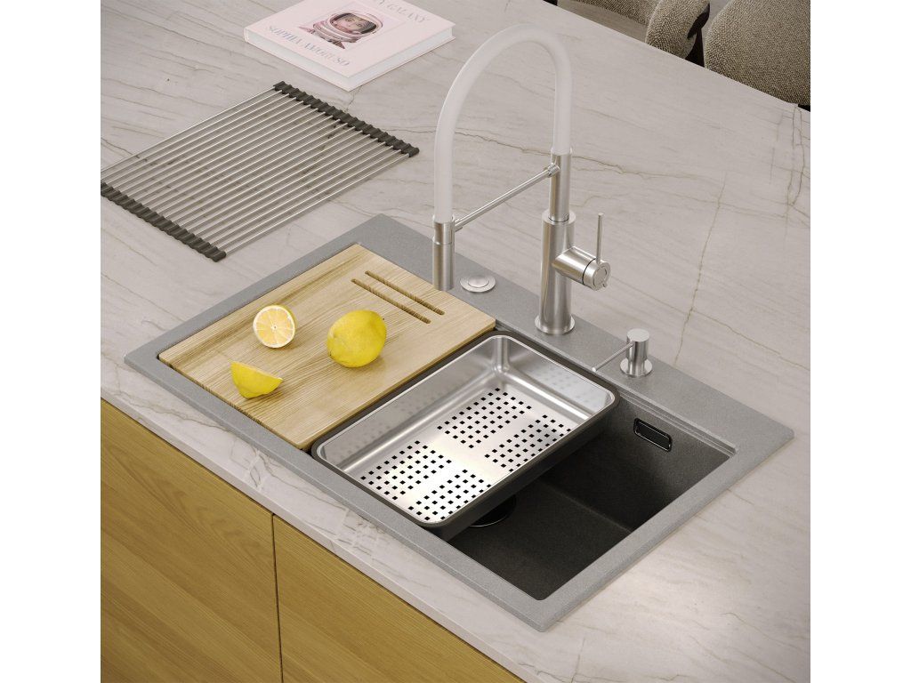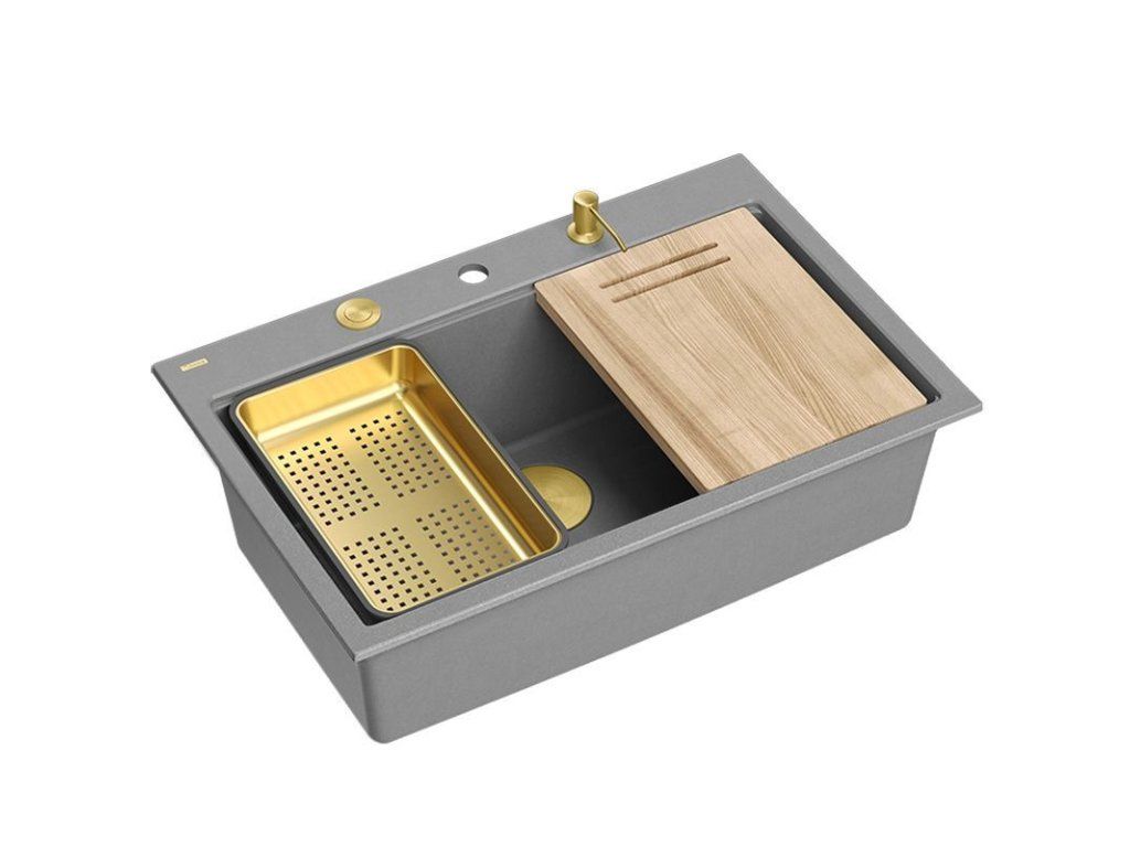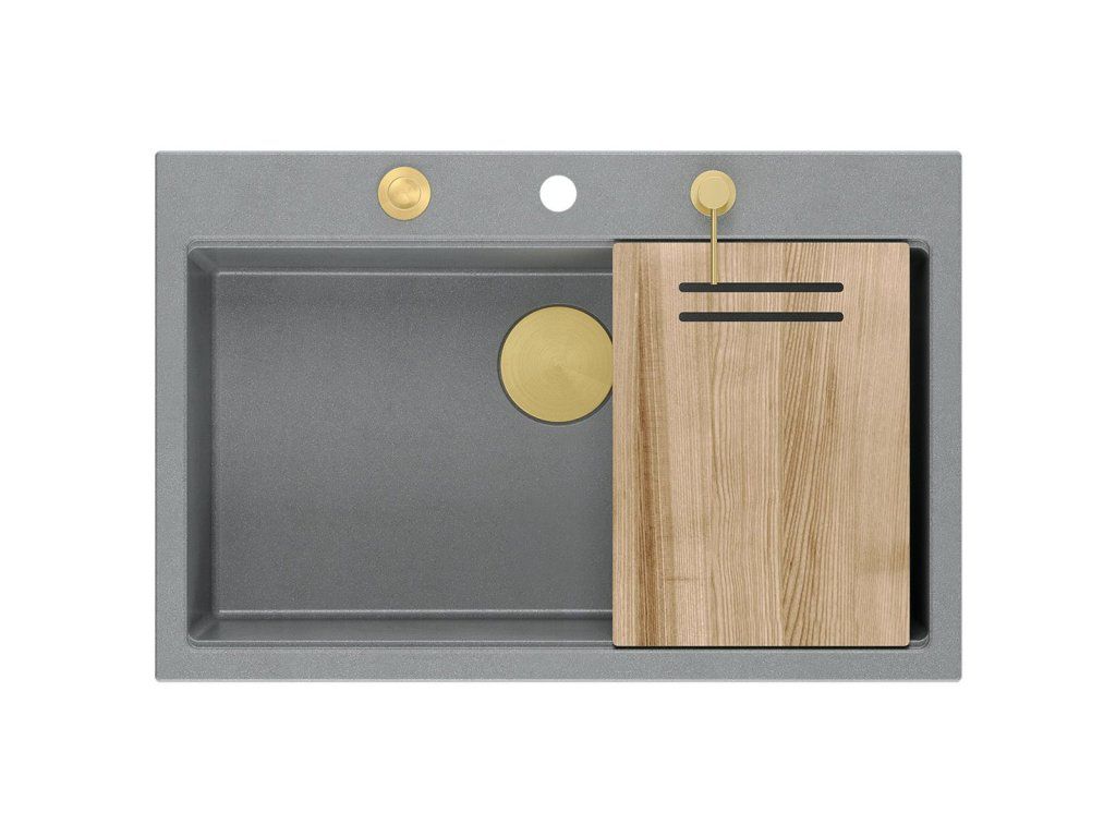 Dranitový drez vyrobený s minimalistickým moderným vzhľadom zapadne do aranžmánu každej kuchyne. Hlboká a priestranná komora zaisťuje vysoký komfort používania. Umývadlo, ktoré ponúkame, je skvelou voľbou pre zákazníkov, ktorí ocenia kvalitu a spracovanie. Nadčasový tvar, použitie prvotriednych materiálov a technológií, skvelý dizajn a kompatibilita použitých riešení zaručujú dokonalý konečný výsledok a vyplnia každý kuchynský priestor. K dispozícii sú rôzne farebné varianty. Tento model je veľmi bohato vybavený doplnkovými kuchynskými doplnkami. Drez je dodávaný s dávkovačom tekutín, bambusovou doskou na krájanie, odkvapkávačom a valcovanou oceľovo-silikónovou podložkou (nie je súčasťou sady v zlatej a medenej variante).Dodatočné parametre