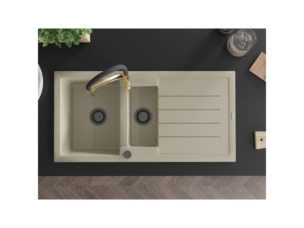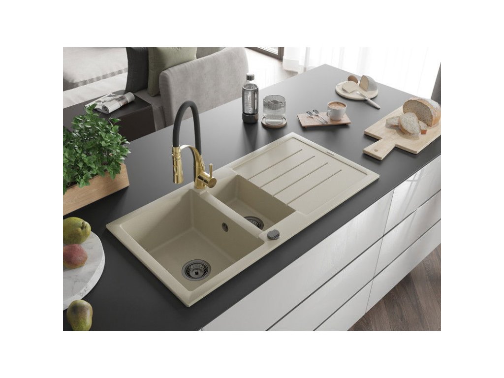 Granitový drez Mexen Andres s 1,5 miskou, odkapávačom a kuchynskou batériou Aster, béžový - 6515-69-73450-57-B