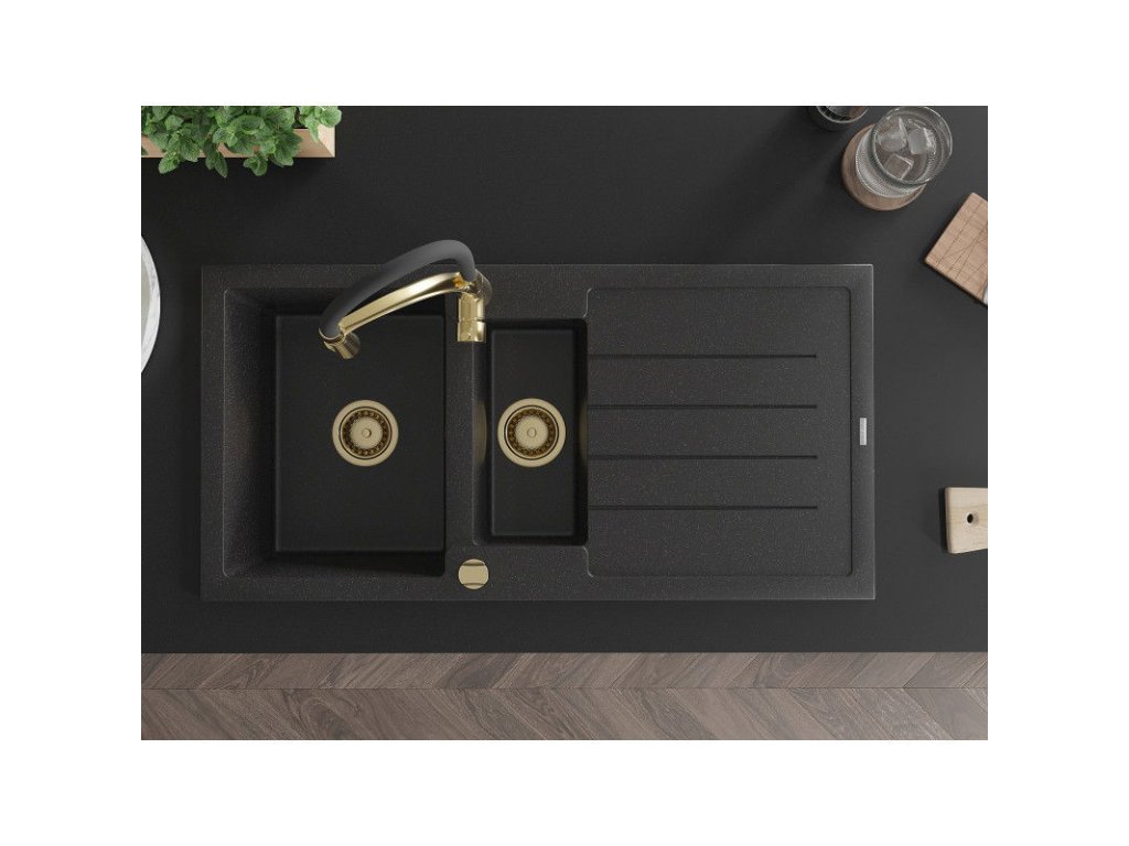 Granitový drez Mexen Andres s 1,5 miskou, odkapávačom a kuchynskou batériou Aster, čierna/strieborná - 6515-73-73450-57-G