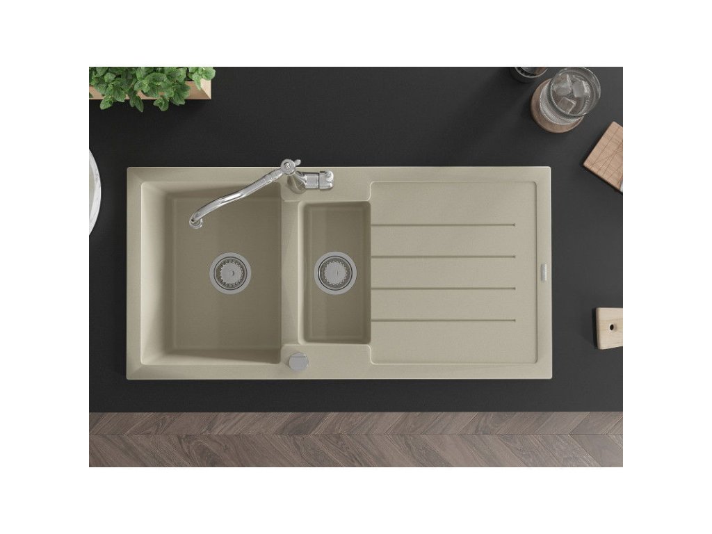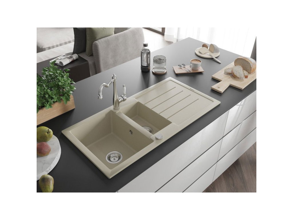 Granitový drez Mexen Andres s 1,5 miskou, odkapávačom a kuchynskou batériou Carla, béžový - 6515-69-670700-00