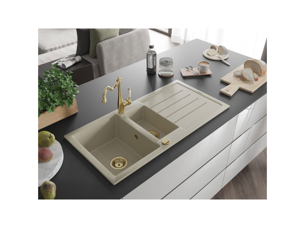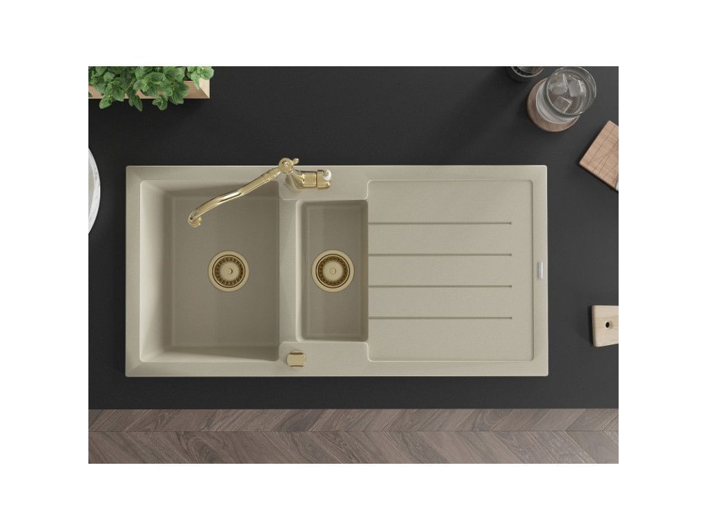 Granitový drez Mexen Andres s 1,5 miskou, odkapávačom a kuchynskou batériou Carla, béžový - 6515-69-670700-50