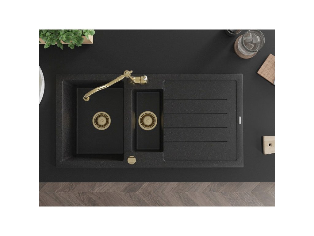 Granitový drez Mexen Andres s 1,5 miskou, odkapávačom a kuchynskou batériou Carla, čierny/strieborný - 6515-73-670700-50