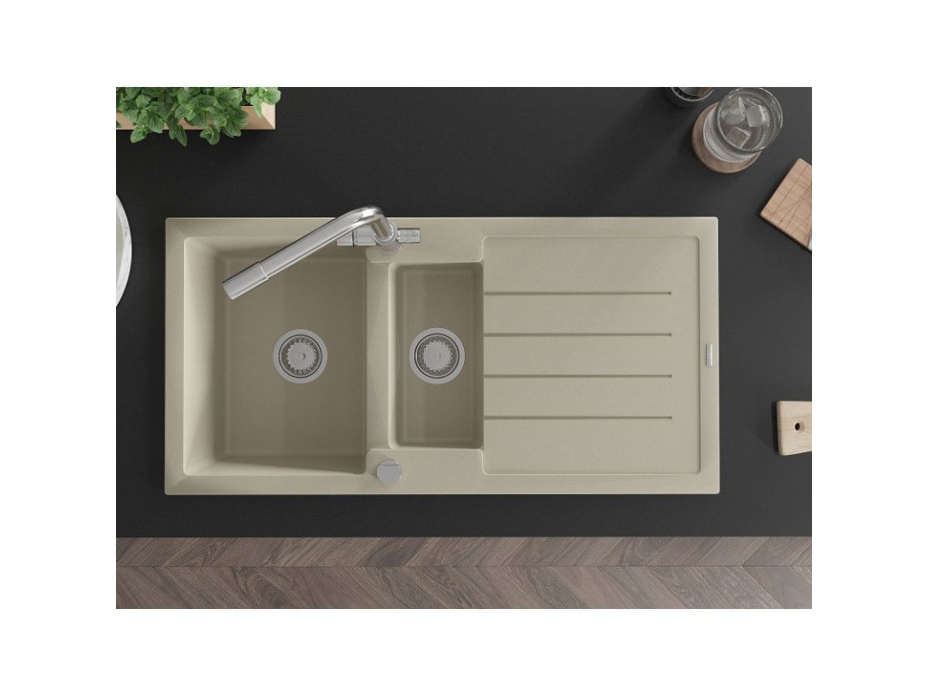 Granitový drez Mexen Andres s 1,5 miskou, odkapávačom a kuchynskou batériou Duero, béžový - 6515-69-671600-00