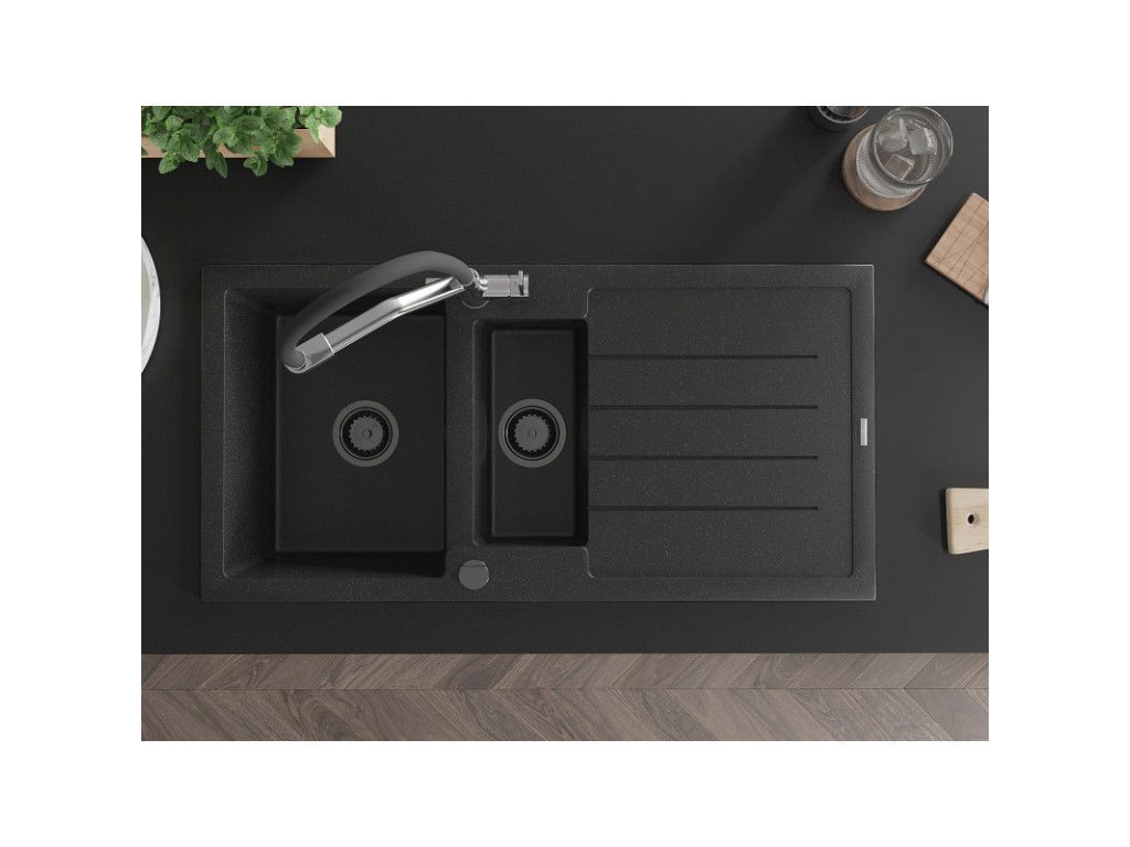 Granitový drez Mexen Andres s 1,5 miskou, odkapávačom a kuchynskou batériou Duo, čierny/strieborný - 6515-73-671701-07-B