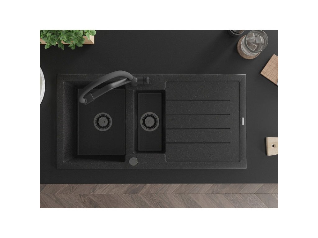 Granitový drez Mexen Andres s 1,5 miskou, odkapávačom a kuchynskou batériou Duo, čierny/strieborný - 6515-73-671701-70-B