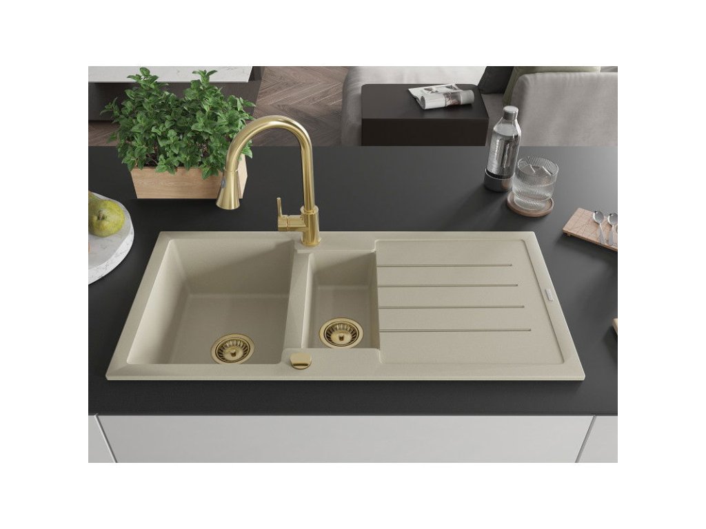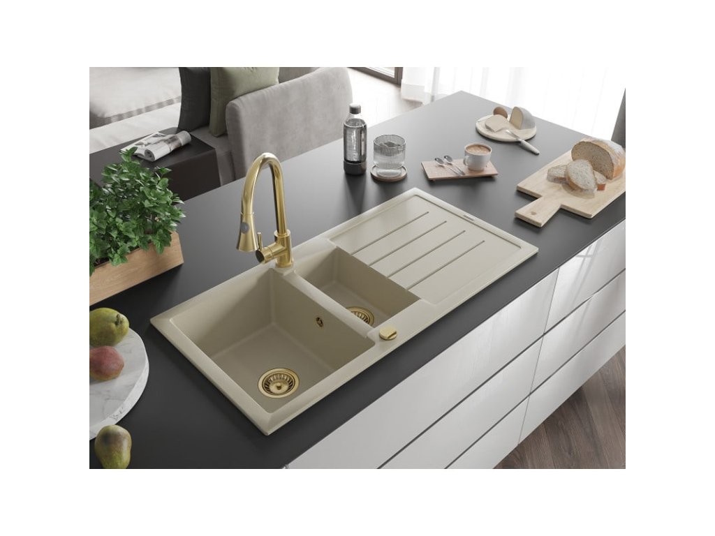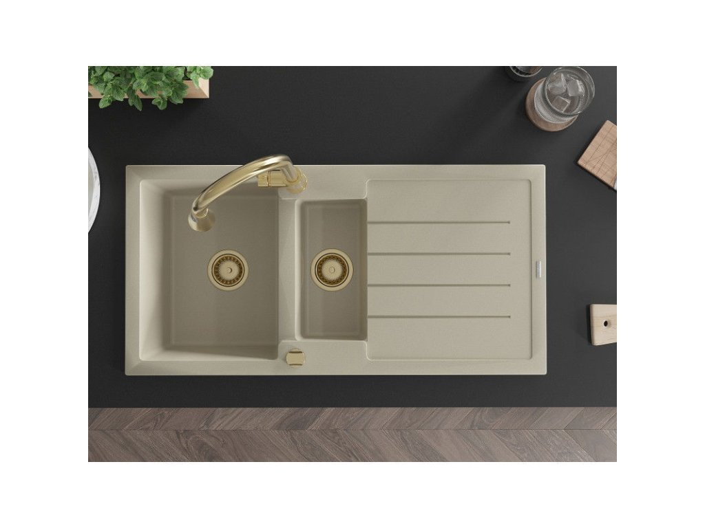 Granitový drez Mexen Andres s 1,5 miskou, odkapávačom a kuchynskou batériou Elia, béžový - 6515-69-670101-50