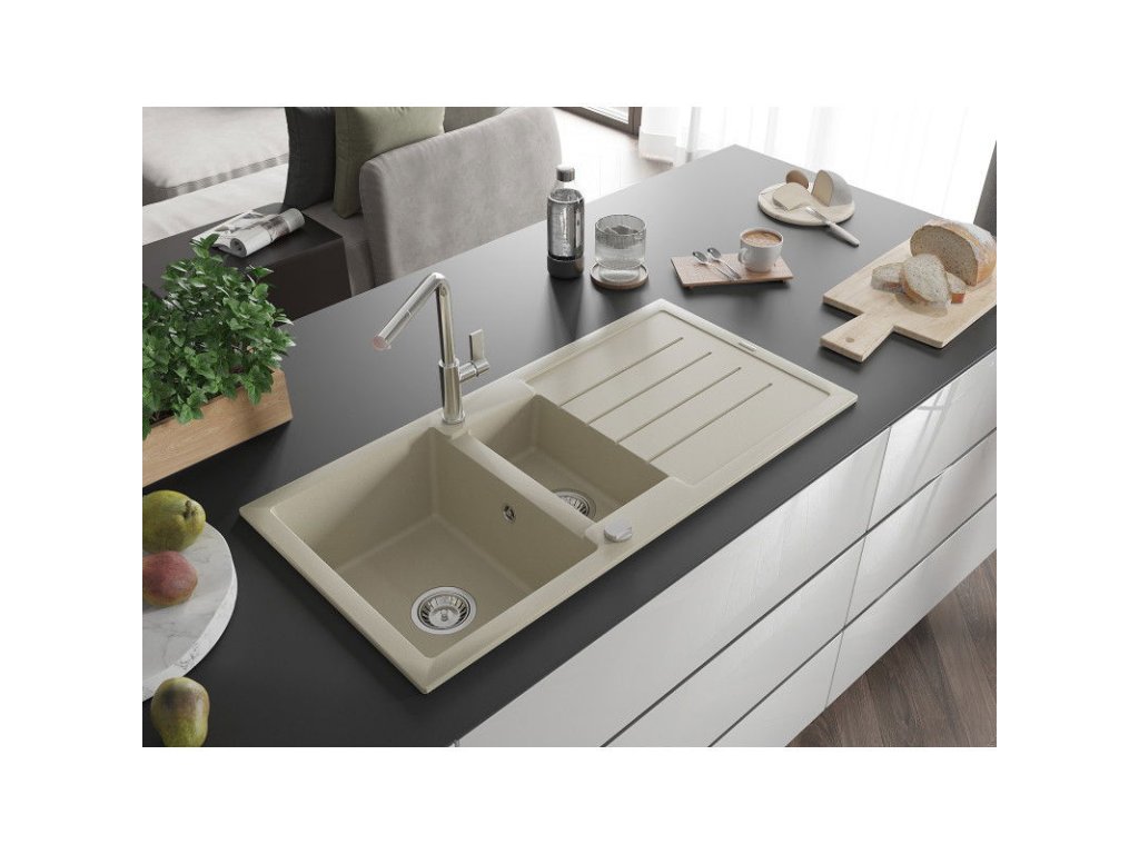 Granitový drez Mexen Andres s 1,5 miskou, odkapávačom a kuchynskou batériou Flora, béžový - 6515-69-670401-00