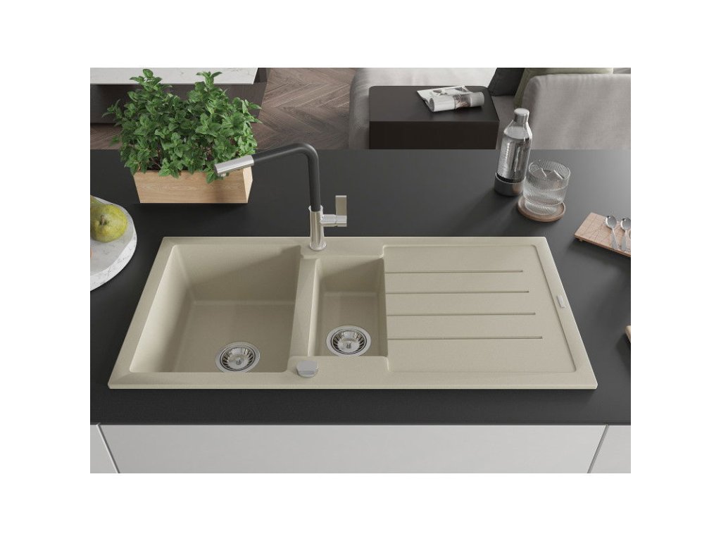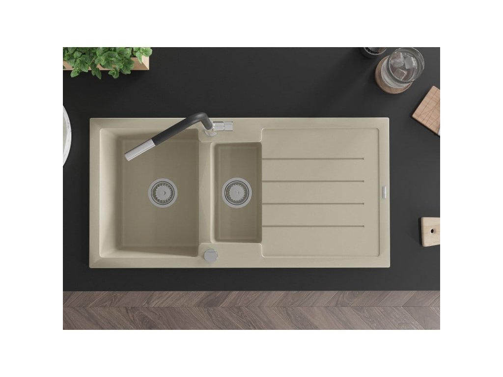 Granitový drez Mexen Andres s 1,5 miskou, odkapávačom a kuchynskou batériou Flora, béžový - 6515-69-670401-07