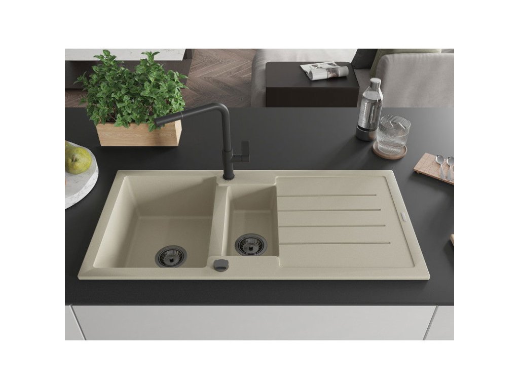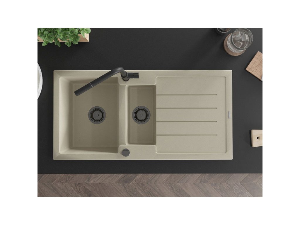 Granitový drez Mexen Andres s 1,5 miskou, odkapávačom a kuchynskou batériou Flora, béžový - 6515-69-670401-70-B