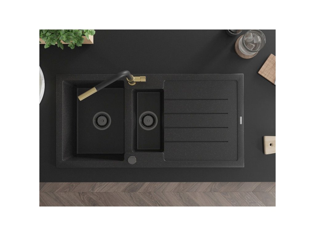Granitový drez Mexen Andres s 1,5 miskou, odkapávačom a kuchynskou batériou Flora, čierna/strieborná - 6515-73-670401-57-B