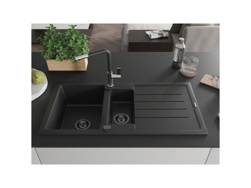 Granitový drez Mexen Andres s 1,5 miskou, odkapávačom a kuchynskou batériou Flora, čierny/strieborný - 6515-73-670401-07-B