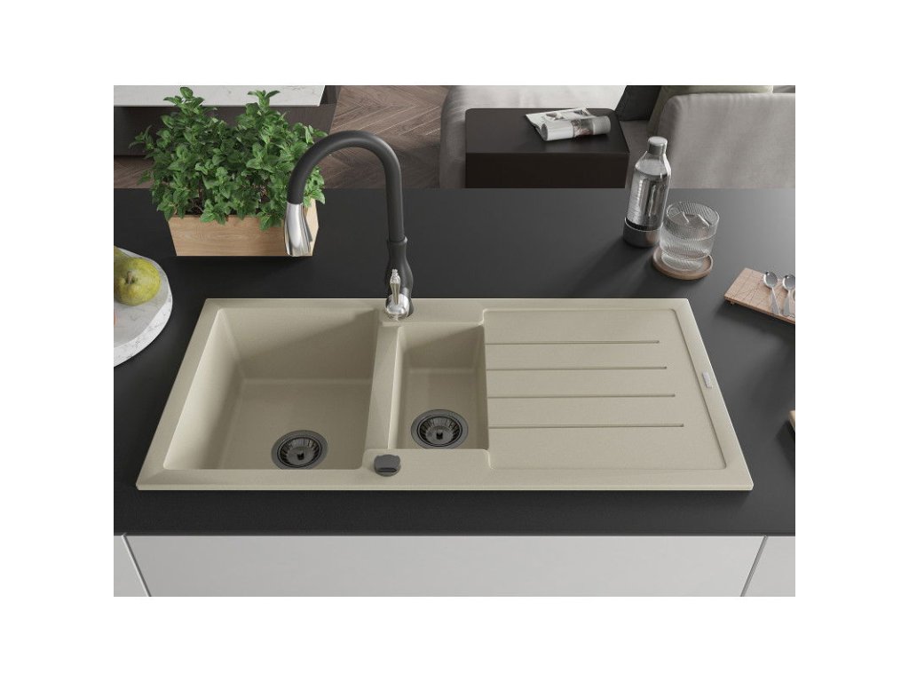 Granitový drez Mexen Andres s 1,5 miskou, odkapávačom a kuchynskou batériou Savita, béžový - 6515-69-672601-70