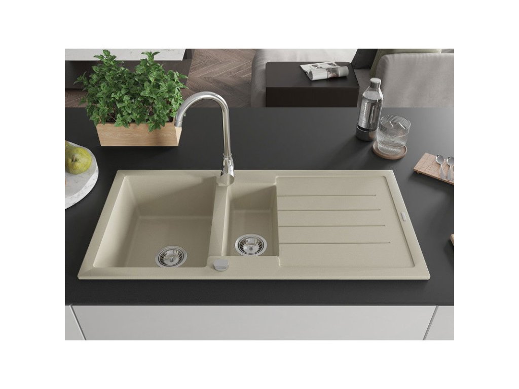 Granitový drez Mexen Andres s 1,5 miskou, odkapávačom a kuchynskou batériou Telma, béžový - 6515-69-670200-00