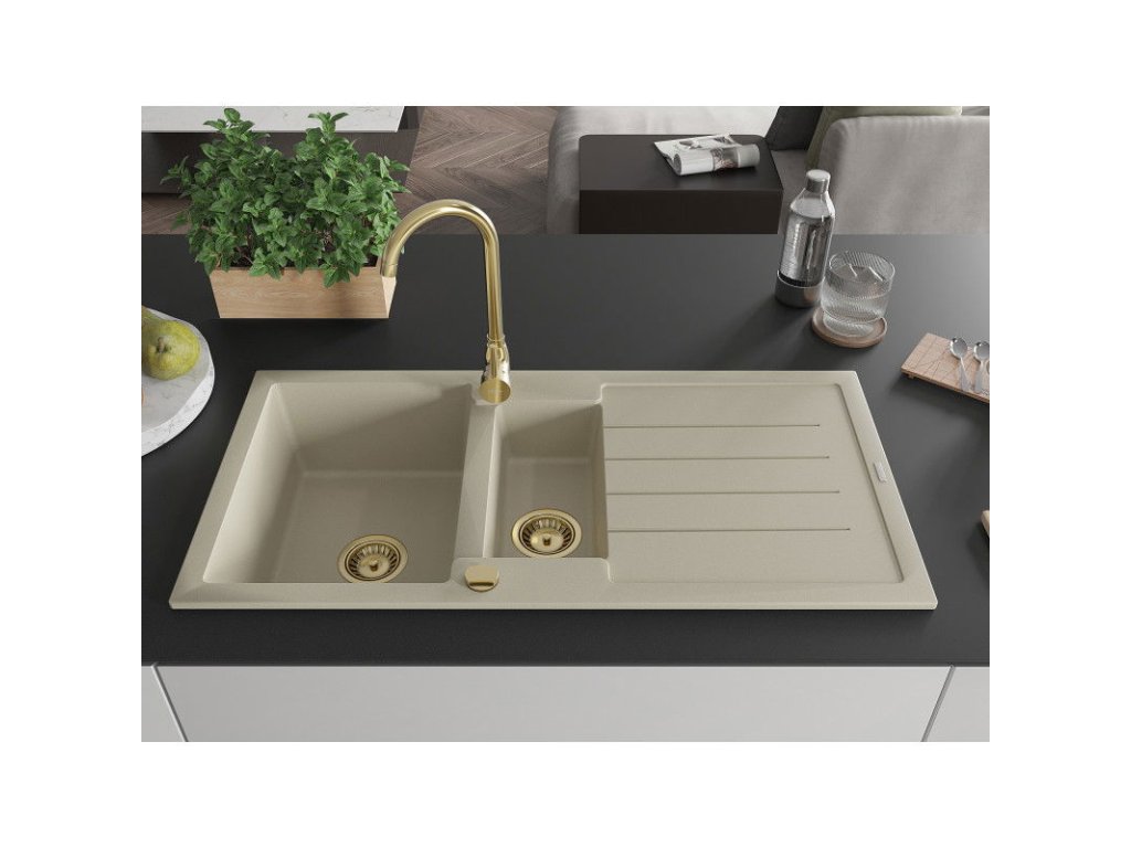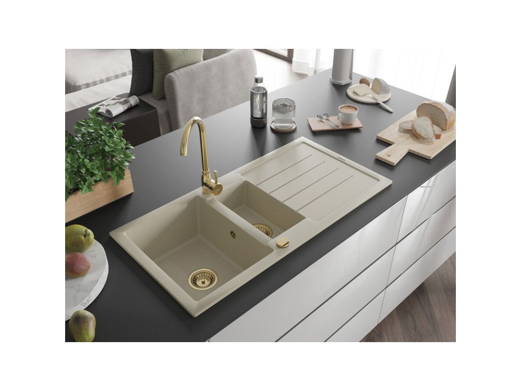 Granitový drez Mexen Andres s 1,5 miskou, odkapávačom a kuchynskou batériou Telma, béžový - 6515-69-670200-50