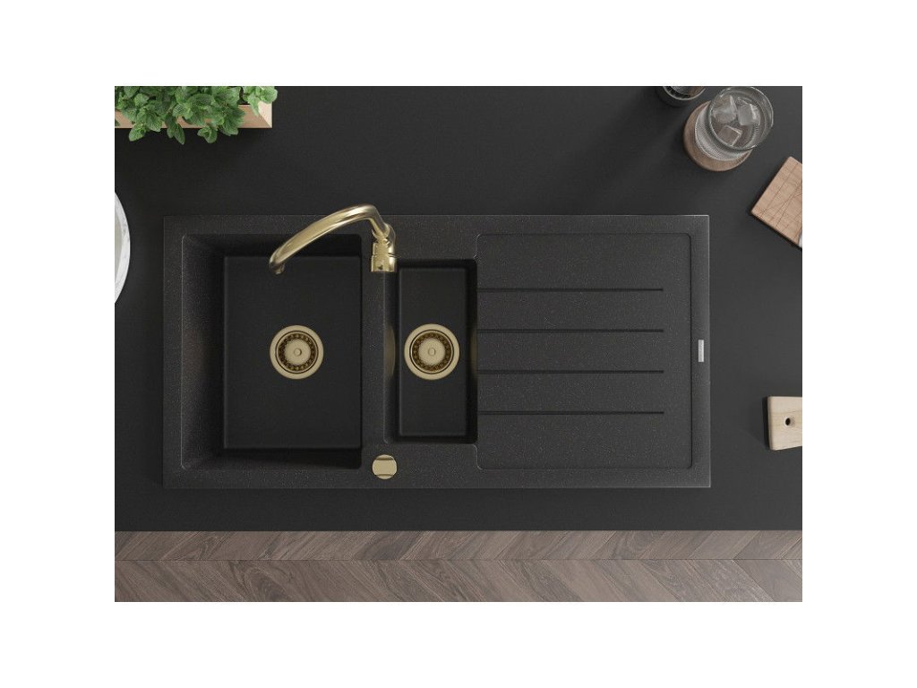 Granitový drez Mexen Andres s 1,5 miskou a odkapávačom 1000 x 500 mm čierny/strieborný metalický, zlatý sifón - 6515101510-73-G