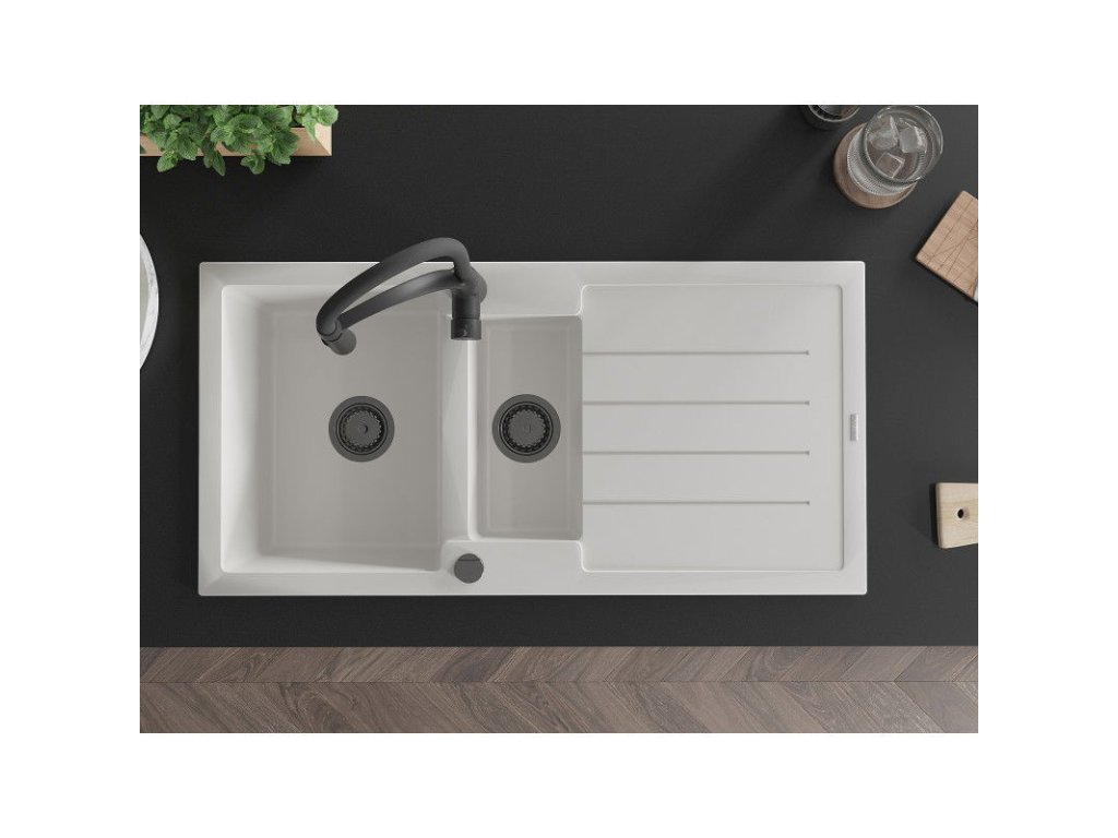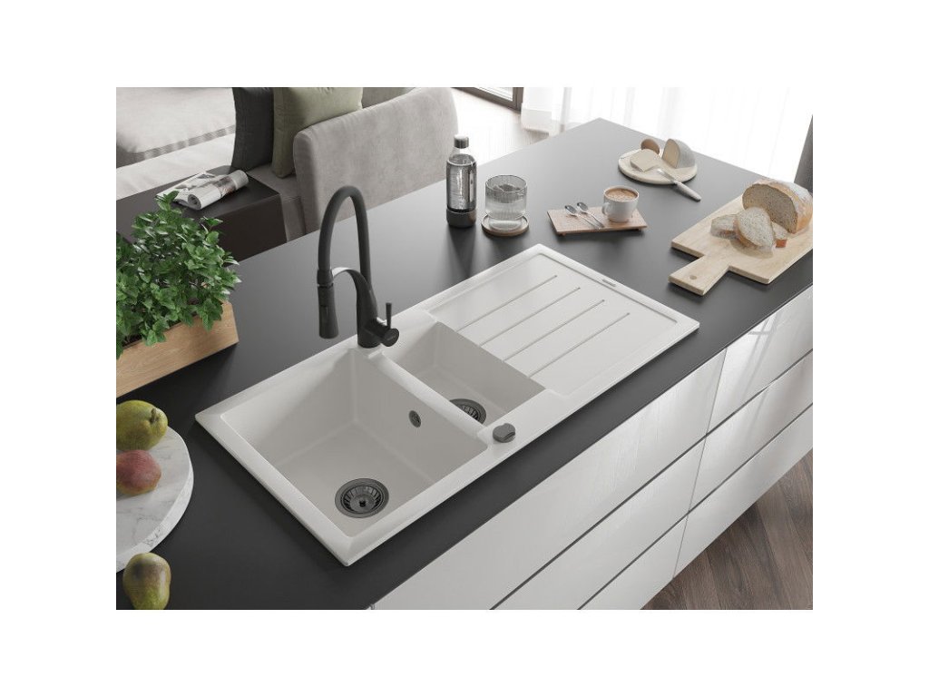 Granitový drez Mexen Andres s 1,5 misky, odkapávačom a kuchynskou batériou Aster, biely - 6515-20-73450-70-B