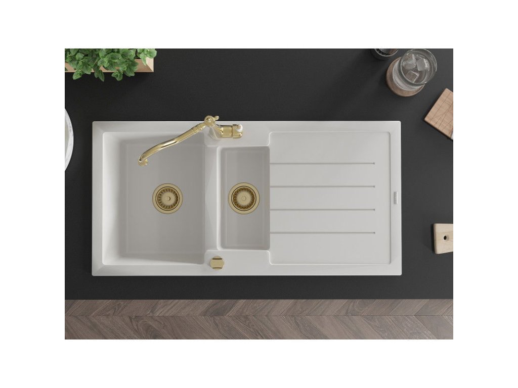 Granitový drez Mexen Andres s 1,5 misky, odkapávačom a kuchynskou batériou Carla, biely - 6515-20-670700-50