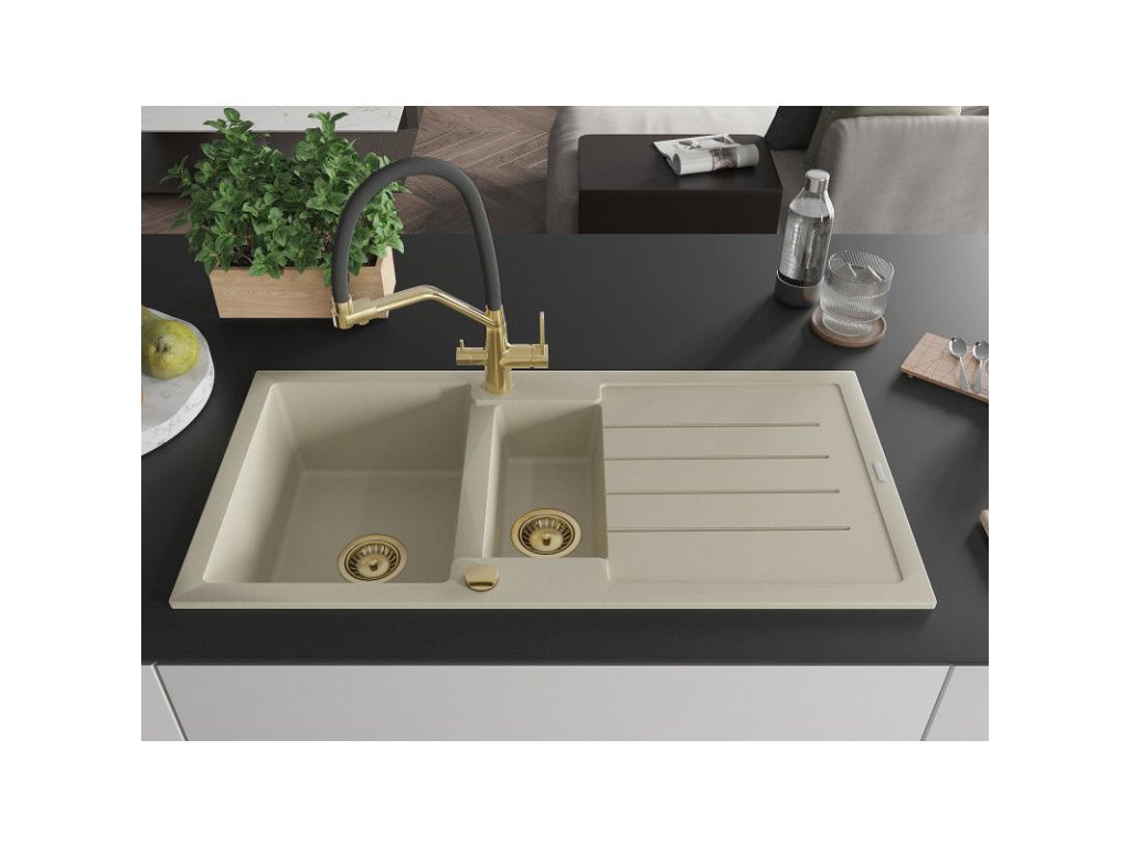 Granitový drez Mexen Andres s 1,5 misky, odkapávačom a kuchynskou batériou Duo, béžový - 6515-69-671701-57-G