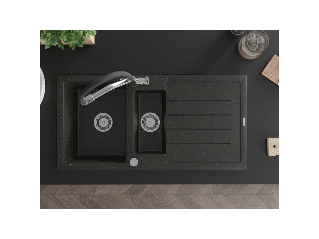 Granitový drez Mexen Andres s 1,5 misky, odkapávačom a kuchynskou batériou Duo, čierna/zlatá metalíza - 6515-75-671701-07