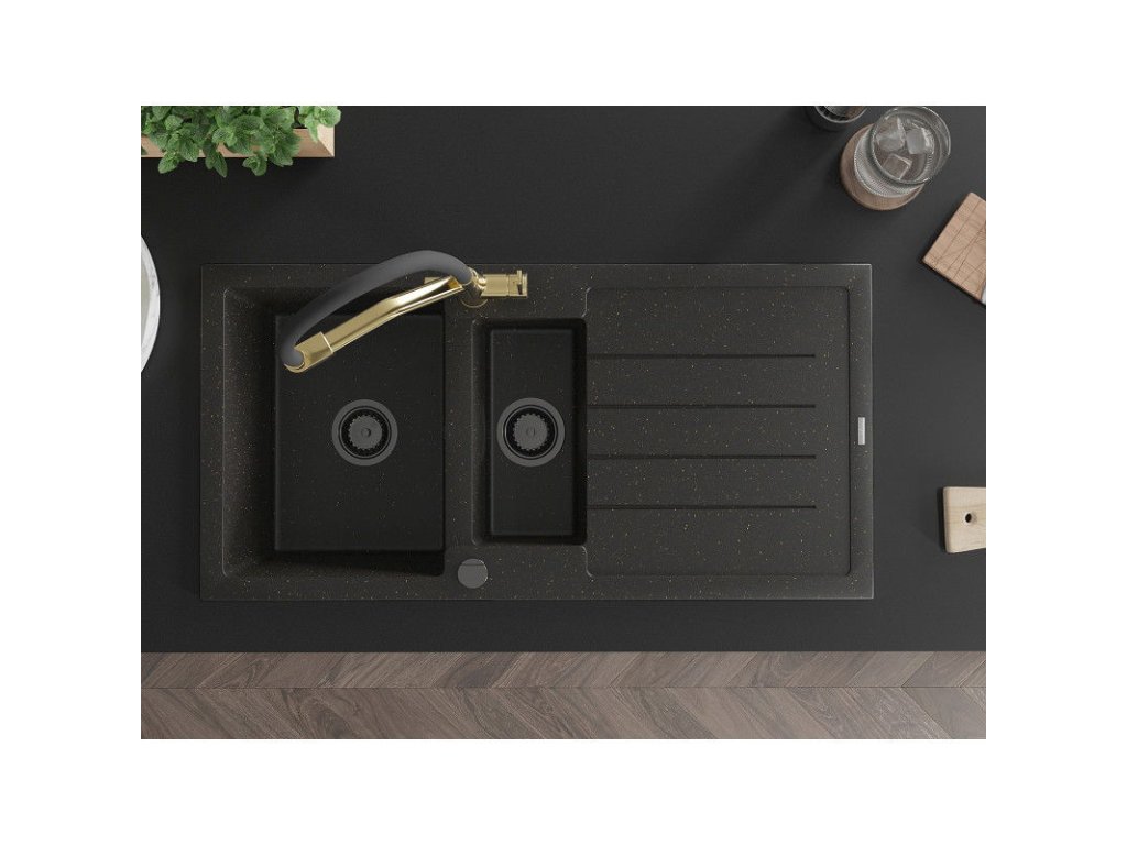Granitový drez Mexen Andres s 1,5 misky, odkapávačom a kuchynskou batériou Duo, čierna/zlatá metalíza - 6515-75-671701-57-B
