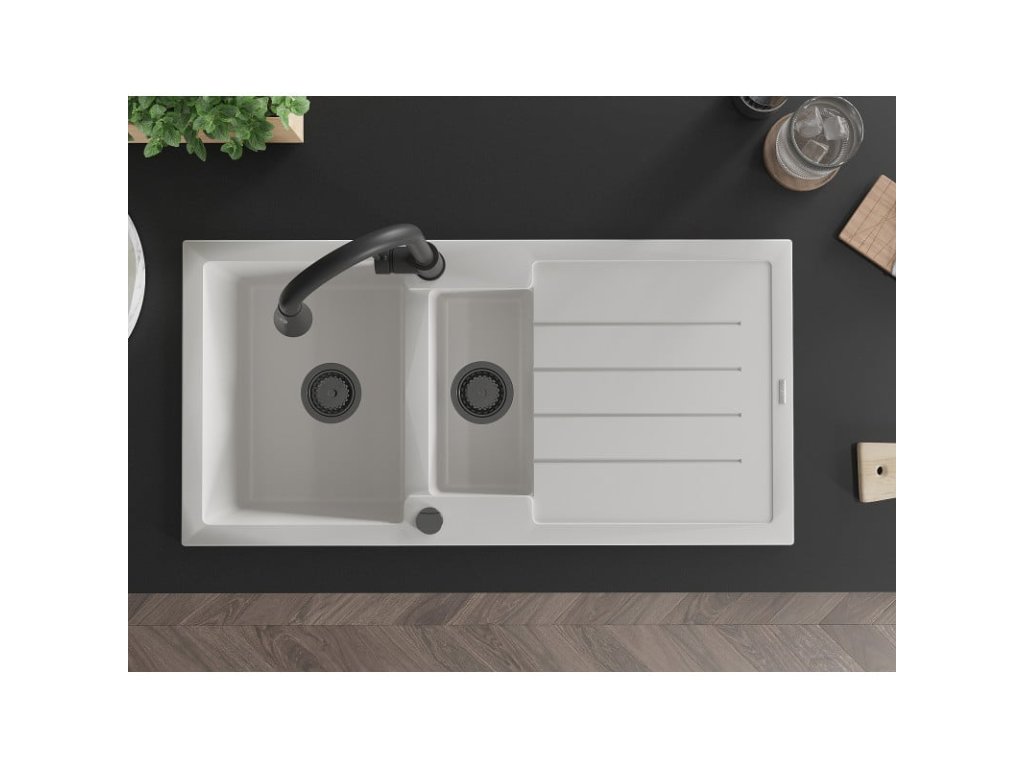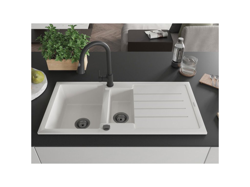 Granitový drez Mexen Andres s 1,5 misky, odkapávačom a kuchynskou batériou Elia, biely - 6515-20-670101-70