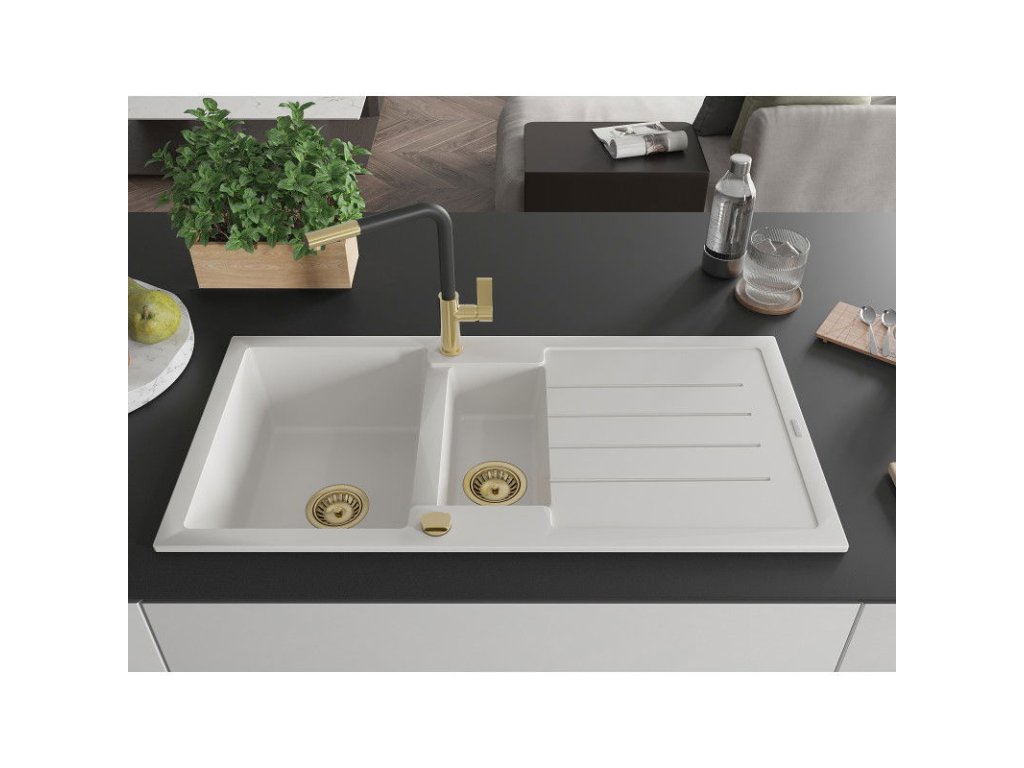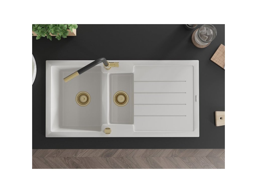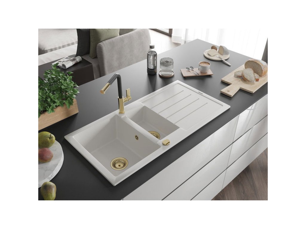 Granitový drez Mexen Andres s 1,5 misky, odkapávačom a kuchynskou batériou Flora, biely - 6515-20-670401-57-G