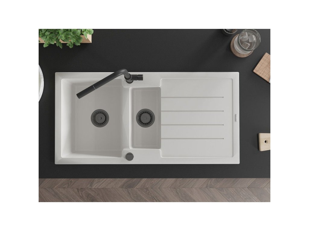 Granitový drez Mexen Andres s 1,5 misky, odkapávačom a kuchynskou batériou Flora, biely - 6515-20-670401-70-B