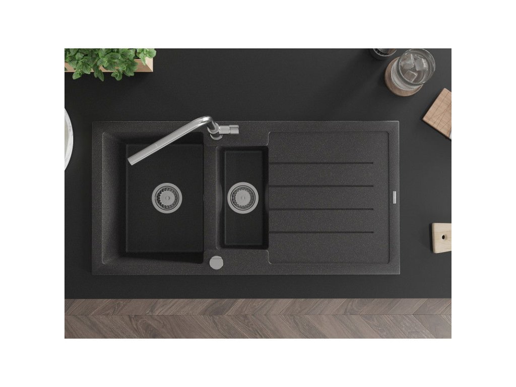 Granitový drez Mexen Andres s 1,5 misky, odkapávačom a kuchynskou batériou Flora, čierna škvrnitá - 6515-76-670401-00