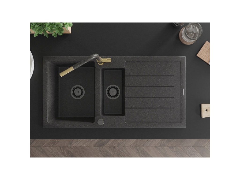 Granitový drez Mexen Andres s 1,5 misky, odkapávačom a kuchynskou batériou Flora, čierna škvrnitá - 6515-76-670401-75-B