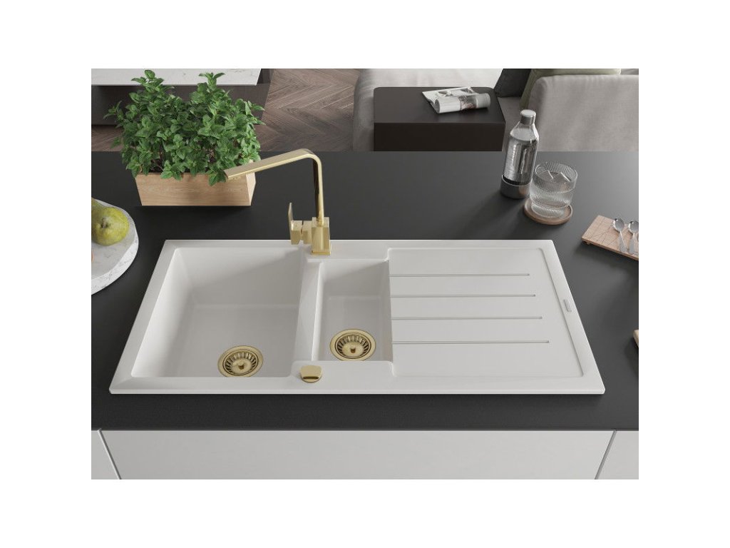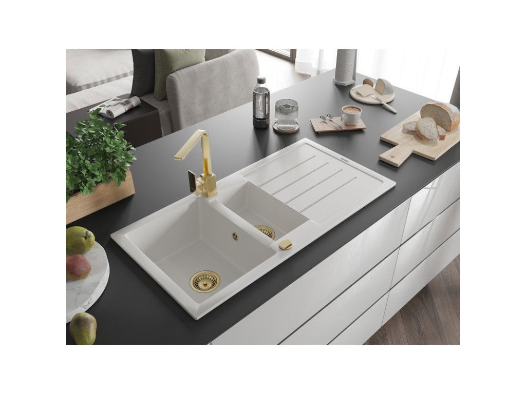 Granitový drez Mexen Andres s 1,5 misky, odkapávačom a kuchynskou batériou Rita, biely - 6515-20-670300-50
