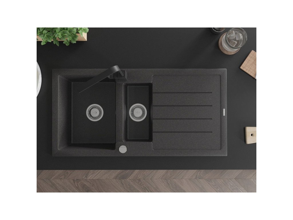 Granitový drez Mexen Andres s 1,5 misky, odkapávačom a kuchynskou batériou Rita, čierna škvrnitá - 6515-76-670300-70