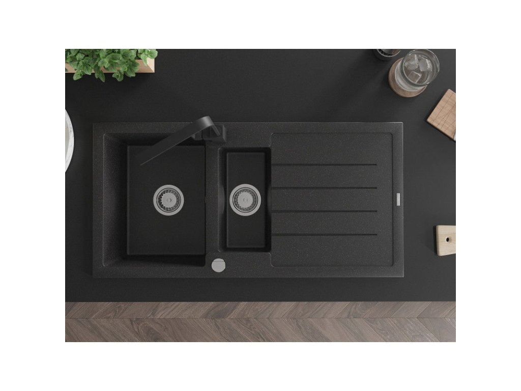 Granitový drez Mexen Andres s 1,5 misky, odkapávačom a kuchynskou batériou Rita, čierna/strieborná metalíza - 6515-73-670300-70