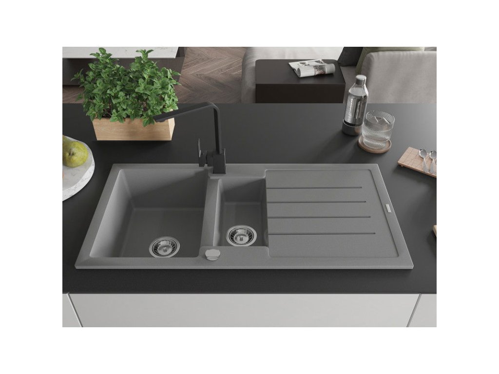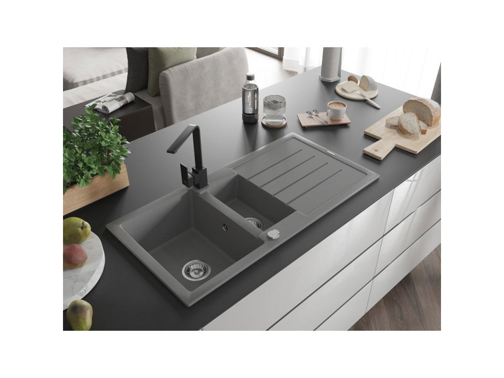 Granitový drez Mexen Andres s 1,5 misky, odkapávačom a kuchynskou batériou Rita, sivý - 6515-71-670300-70