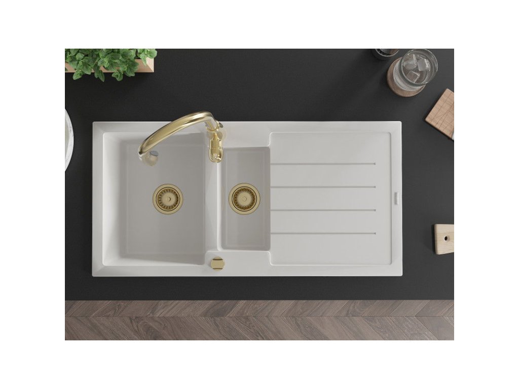 Granitový drez Mexen Andres s 1,5 misky, odkapávačom a kuchynskou batériou Savita, biely - 6515-20-672601-50