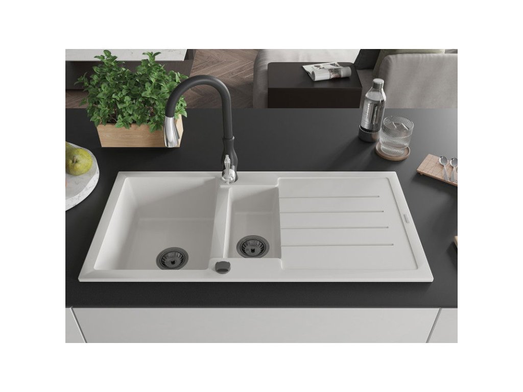 Granitový drez Mexen Andres s 1,5 misky, odkapávačom a kuchynskou batériou Savita, biely - 6515-20-672601-70