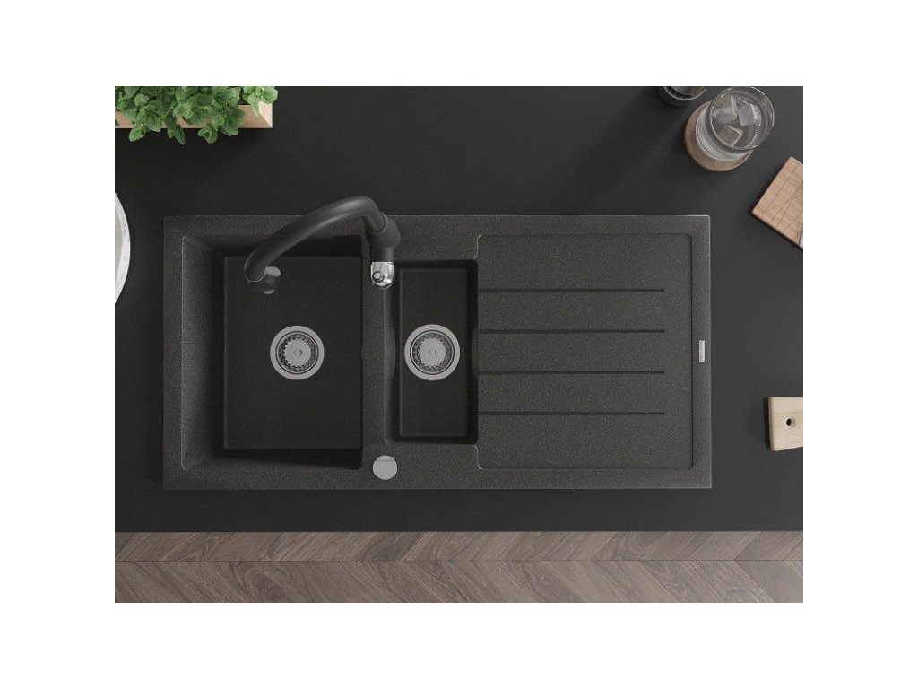 Granitový drez Mexen Andres s 1,5 misky, odkapávačom a kuchynskou batériou Savita, čierna škvrnitá - 6515-76-672601-70