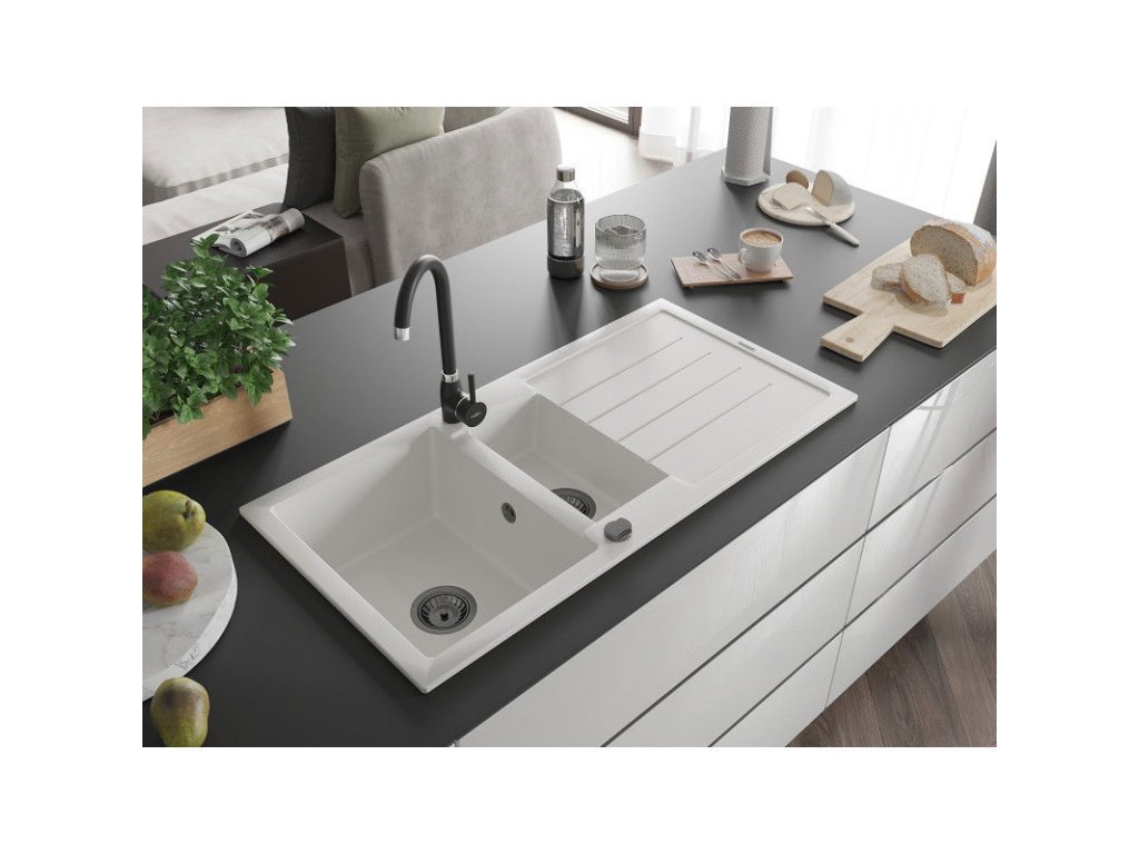 Granitový drez Mexen Andres s 1,5 misky, odkapávačom a kuchynskou batériou Telma, biely - 6515-20-670200-70