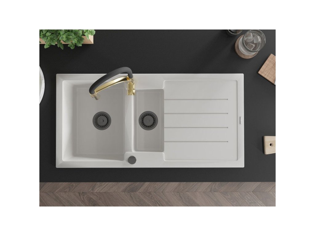 Granitový drez Mexen Andres s 1,5 misy, odkapávačom a kuchynskou batériou Aster, biely - 6515-20-73450-57-B