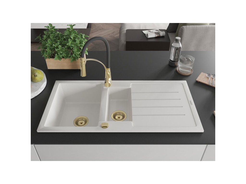 Granitový drez Mexen Andres s 1,5 misy, odkapávačom a kuchynskou batériou Aster, biely - 6515-20-73450-57-G