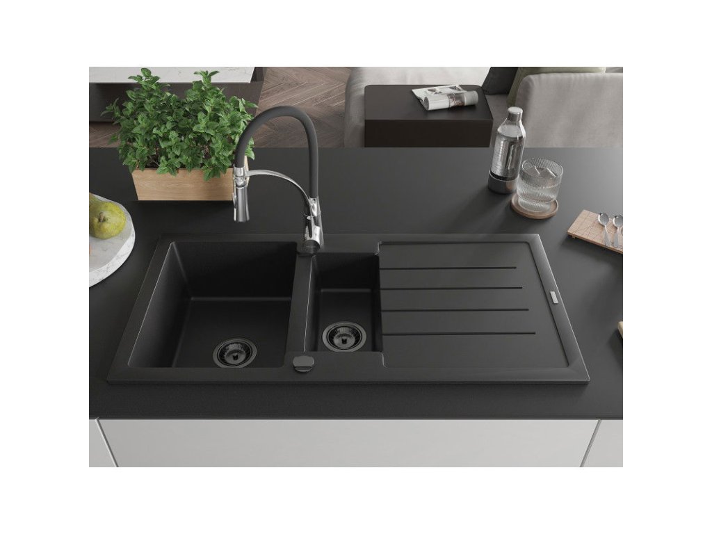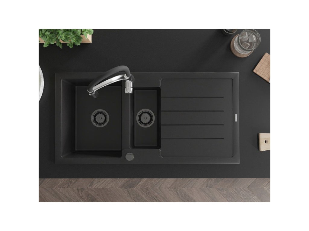 Granitový drez Mexen Andres s 1,5 misy, odkapávačom a kuchynskou batériou Aster, čierny - 6515-77-73450-07-B