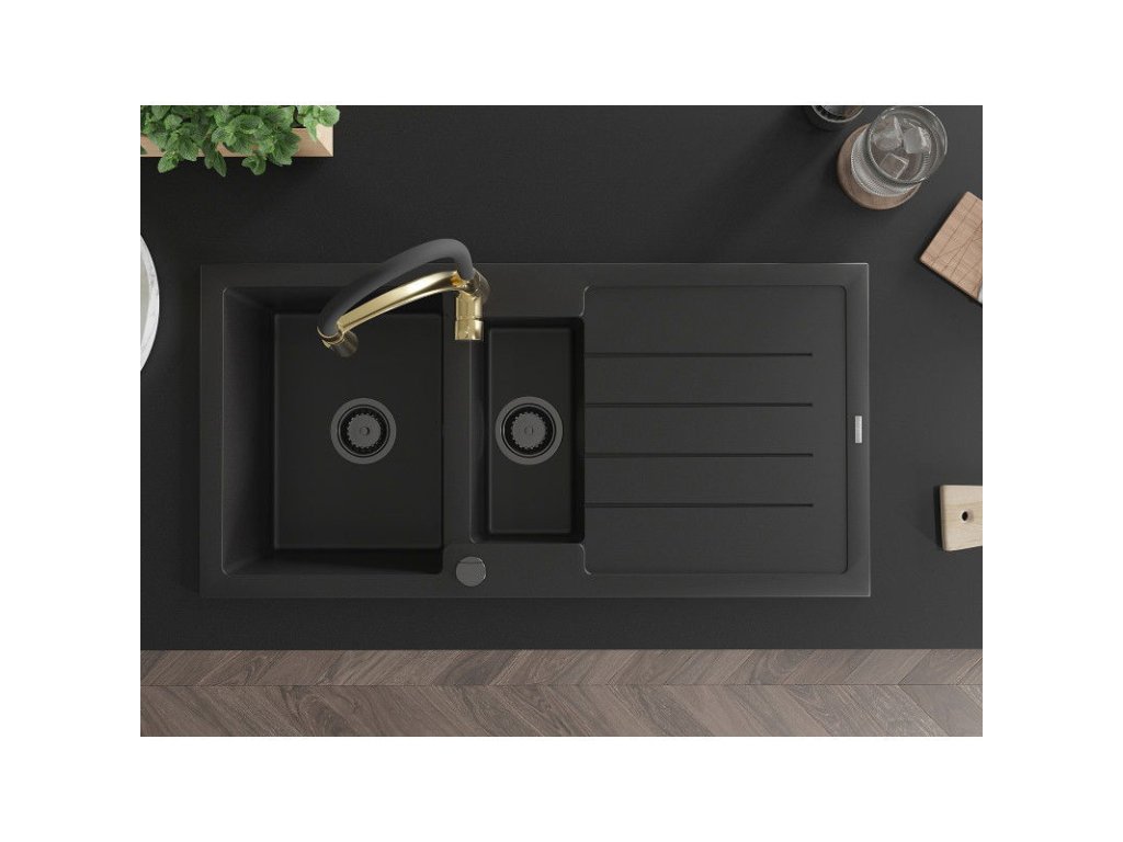 Granitový drez Mexen Andres s 1,5 misy, odkapávačom a kuchynskou batériou Aster, čierny - 6515-77-73450-57-B
