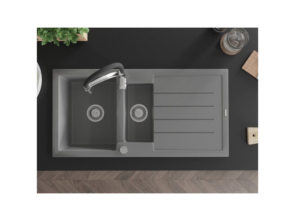 Granitový drez Mexen Andres s 1,5 misy, odkapávačom a kuchynskou batériou Aster, sivý - 6515-71-73450-07
