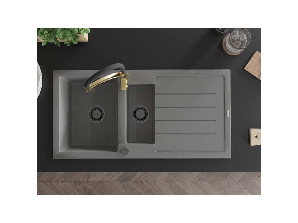 Granitový drez Mexen Andres s 1,5 misy, odkapávačom a kuchynskou batériou Aster, sivý - 6515-71-73450-57-B