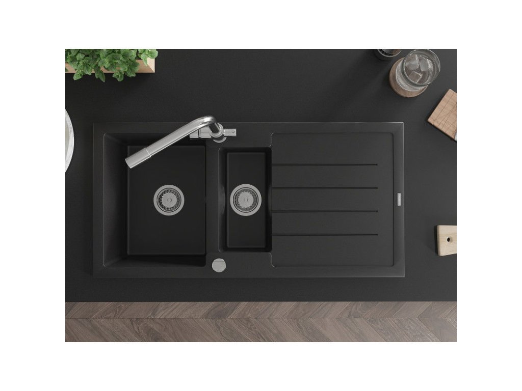Granitový drez Mexen Andres s 1,5 misy, odkapávačom a kuchynskou batériou Duero, čierny - 6515-77-671600-00